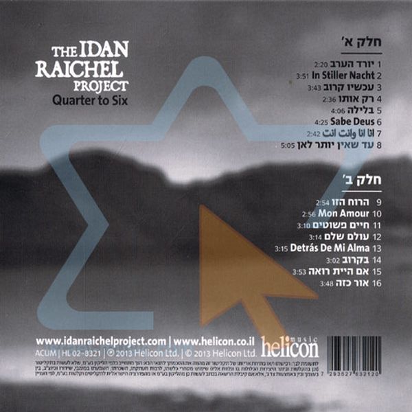 ![]() | Notes: The Idan Raichel Project’s latest album, Quarter to Six, features guest appearances by Portuguese fado star Ana Moura, Palestinian-Israeli singer Mira Awad, German counter-tenor Andreas Scholl, Colombia’s Marta Gomez, Vieux Farka Toure and a selection of some of Israel’s top up-and-coming singers and musicians. |